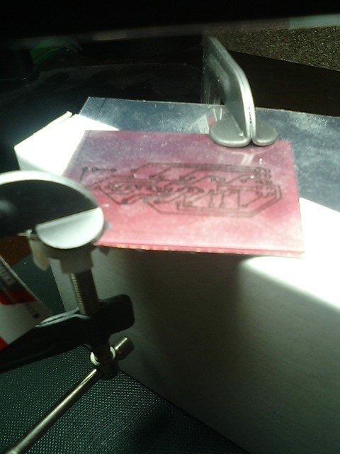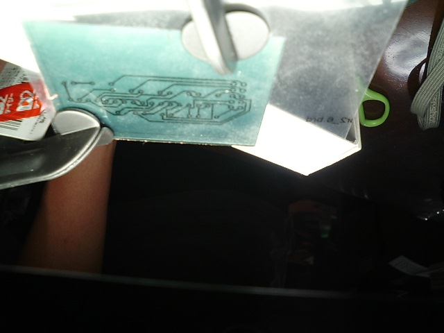 上は感光前の基板、下は感光後の基板です。時間は蛍光灯なら20分程度かかるとという話がありますが、色の移り変わりをみて適度に切り上げると焼きすぎを防げるかと思います。