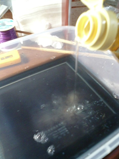 この写真は使い終わった現像液を酢酸で中和しているところです。wikiで「現像剤」と調べると、アルカリ性の現像液を中和して現像能力を失わせるために酢酸を用いているようですね。↑の写真では酢酸の添加部分が透明に、下の中和済みの現像液では青色の浮遊物ができていることがわかります。