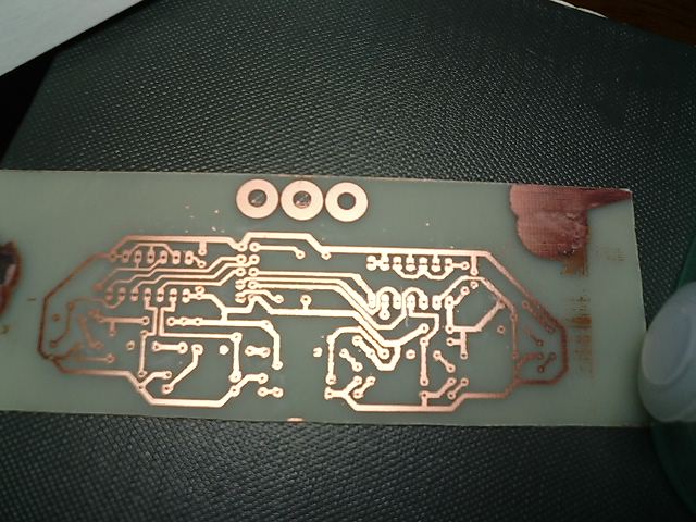 あー・・・。失敗しました。露光時間が長すぎor遮光能力を超える紫外線の照射をしてしまったせいか、断線しまくりです。油性ペンで修正してエッチングしたんですが、いい加減に修正しすぎた・・・。(まぁ9割修正必要だったし。)